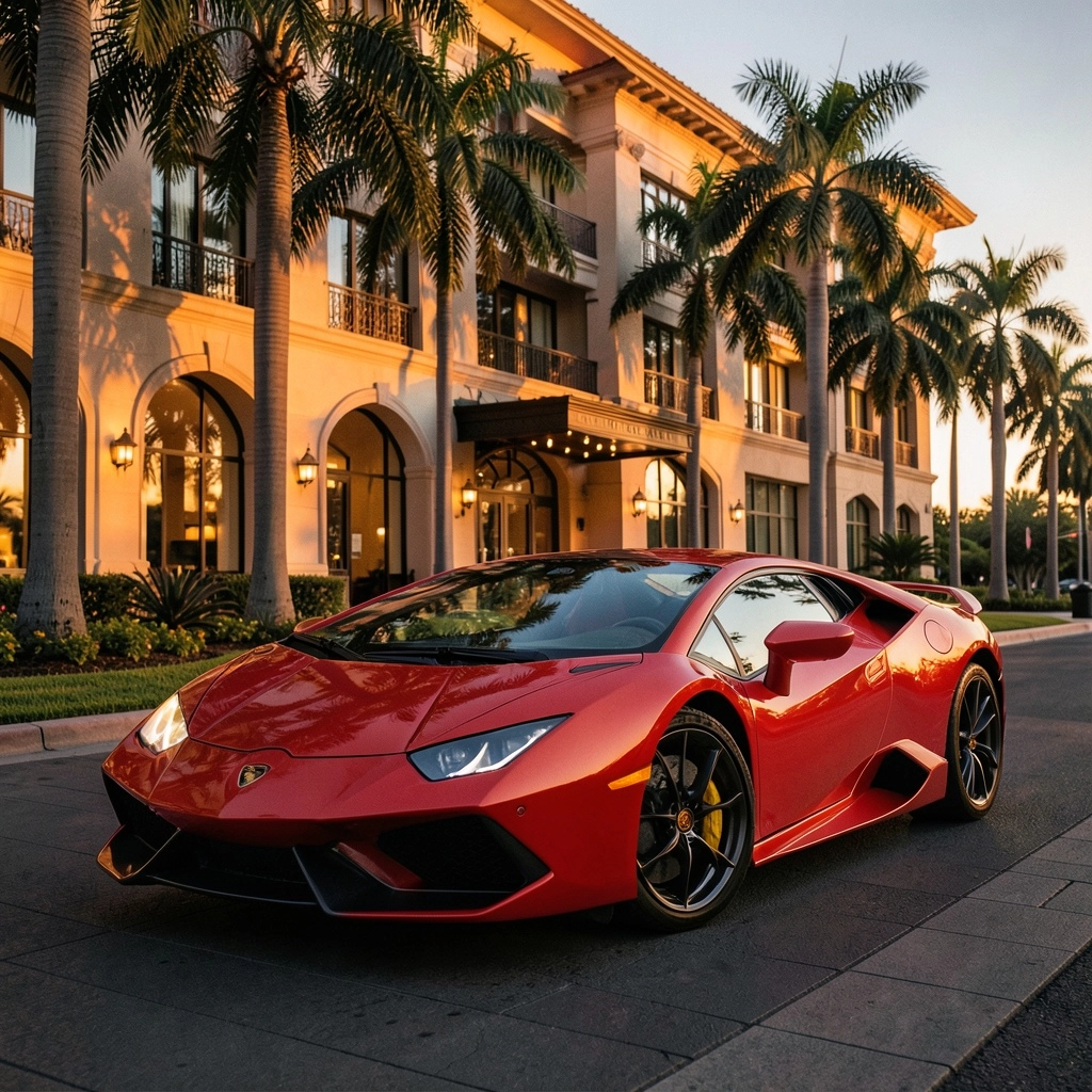Stylish Lamborghini parked in front of a luxury hotel, palm trees, sunset lighting, Instagram aesthetic, soft shadows, high contrast, professional photography, lifestyle shot